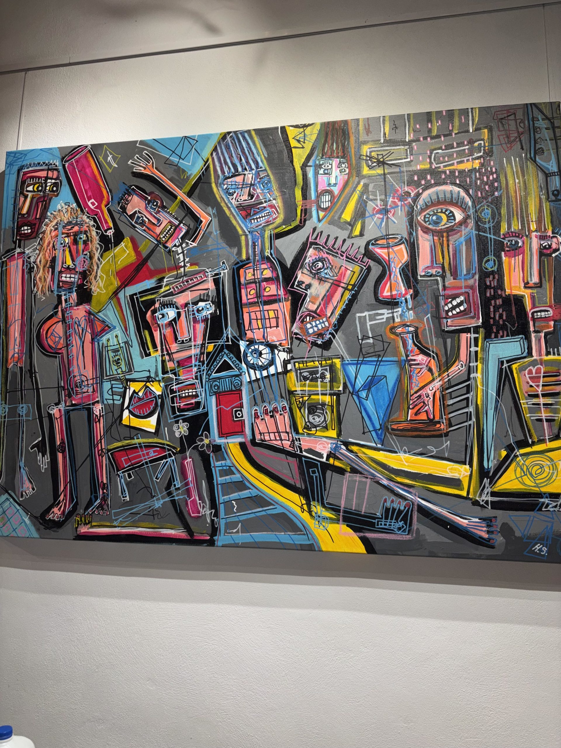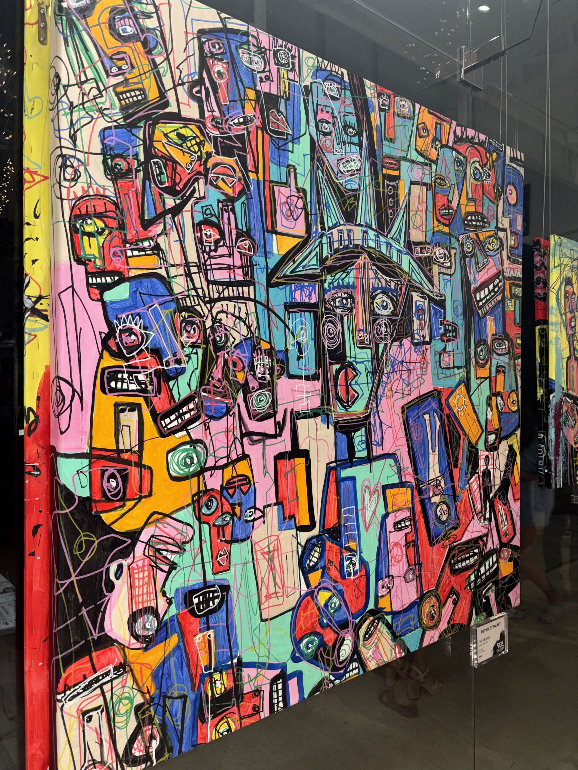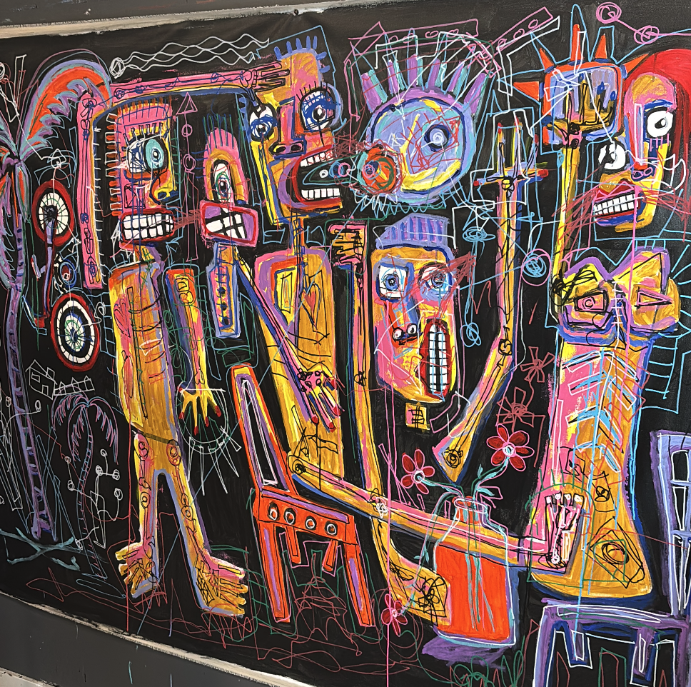 A vibrant collision of fragmented faces, mechanical forms, and architectural symbols pulses across the canvas, layering emotion, tension, and movement in bold color and restless line. The composition feels like a map of the modern psyche—crowded, interconnected, and searching for meaning within the noise of identity, memory, and constant motion.